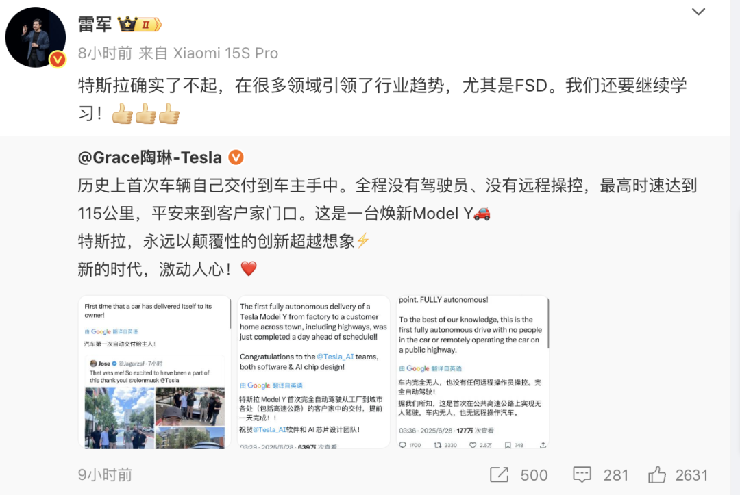 值得注意的是,特斯拉公司副总裁陶琳在微博上分享了这条消息后,刚刚发布完YU7并以Model Y为目标竞争对手的小米创始人、董事长兼CEO雷军迅速转发祝贺,并表示“特斯拉确实了不起,在很多领域引领了行业趋势,尤其是FSD。我们还要继续学习!”